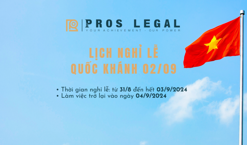 By admin Tháng 8 30, 2024 No Comments DOANH NGHIỆP - ĐẦU TƯ Kính gửi Quý Đối tác, Quý Khách hàng,Pros Legal xin thông báo lịch nghỉ lễ Quốc khánh 02/09 như sau:• Thời gian nghỉ lễ: Từ 31/8 đến hết 03/9/2024• Làm việc trở lại vào ngày 04/9/2024Kính chúc Quý Đối tác, Quý Khách hàng một kỳ nghỉ lễ an lành và hạnh phúc! Share: Previous Post Chi phí thông báo trên phương tiện thông tin đại chúng là lệ phí đương sự có yêu cầu thông báo chịu Newer Post Chi phí thông báo trên phương tiện thông tin đại chúng theo quy định tại dự thảo Pháp lệnh Chi phí tố tụng